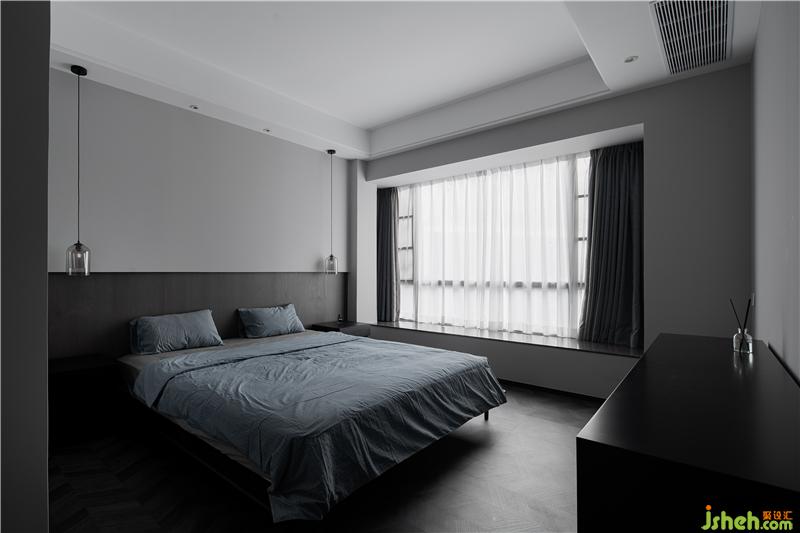 采用無(wú)主燈設(shè)計(jì),讓空間更加整潔,床頭背景下的燈帶讓房間燈光更加有層次。床頭深灰色木質(zhì)墻板內(nèi)退,讓空間更加有材質(zhì)上層次變化。