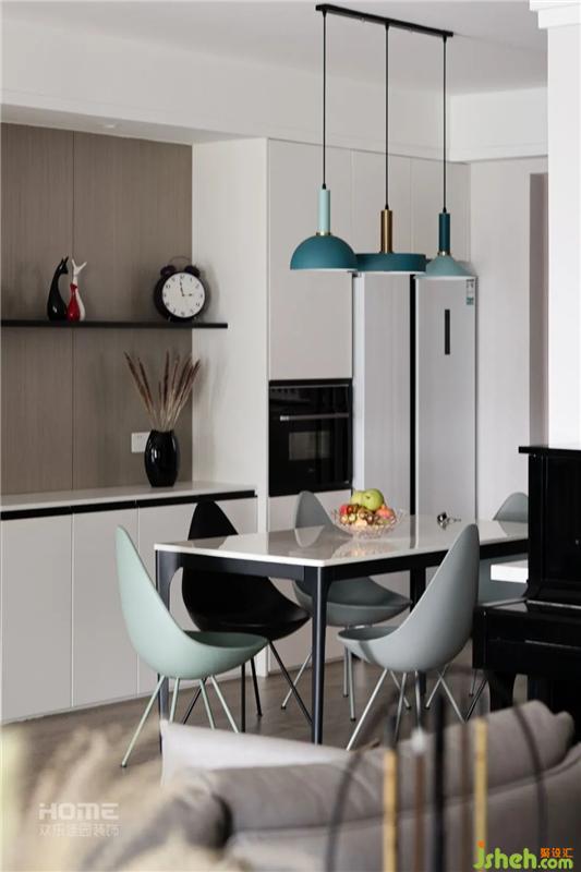 餐廳空間延伸了客廳的寬敞明亮,淡抹綠的餐椅映襯吊燈的顏色。家居設(shè)計(jì)豐富了空間色彩的層次感。設(shè)計(jì)師在餐廳增加了一組高柜加操作臺(tái),滿足客戶的烹飪需求。