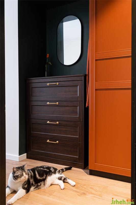 臥室中用赤紅色的內(nèi)嵌衣柜搭配深墨綠色的墻面,帶著時代的印記而不沉悶。摒傳統(tǒng)設(shè)計,在張力十足的線條勾勒、層次豐富的材質(zhì)運用以及極具質(zhì)感的裝飾細(xì)節(jié)下,為居住者帶來一種奢雅的生活享受。