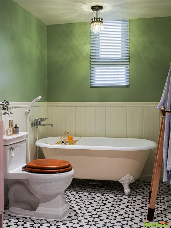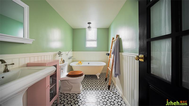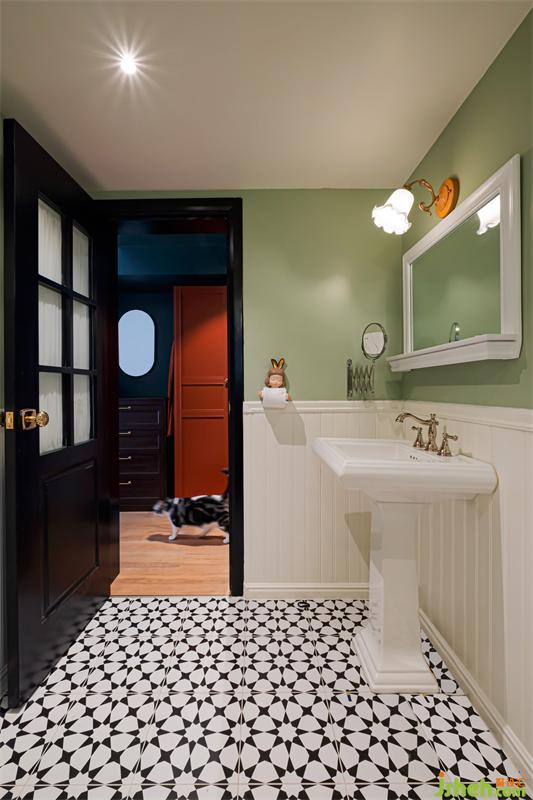 衛(wèi)生間采用墻裙+彩色漆面的搭配,再配合復(fù)古潔具,這樣的搭配讓空間看起來更加富有歷史感和神秘感。