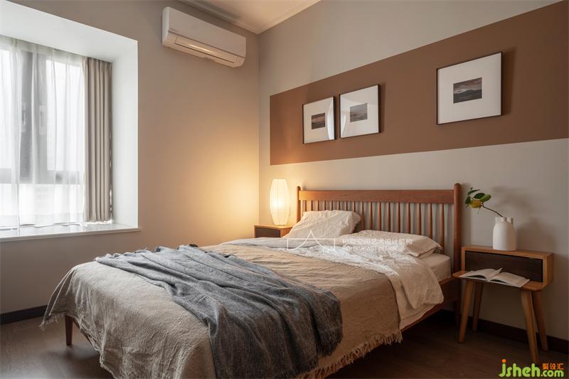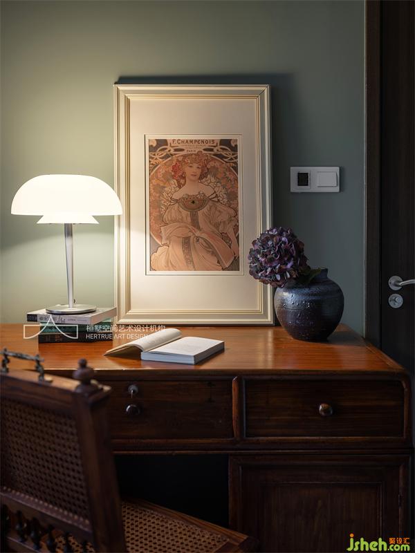 依舊是純粹的自然元素,裝飾畫刻意留白,宣紙臺燈的光線柔美而溫馨,天地鎖和實(shí)木衣柜的匹配,增添了一絲復(fù)古感。