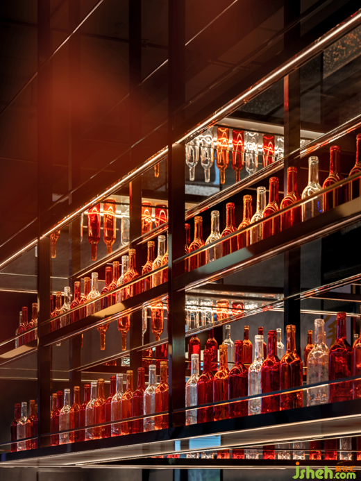 吧臺區(qū)與接待區(qū)實現(xiàn)了無界聯(lián)動,共享著相似的設(shè)計語言。燦紅色的金屬裝飾板、玻璃磚與彩色玻璃瓶拼接出時尚的基調(diào)和微妙質(zhì)感,炫酷的材質(zhì)融入室內(nèi)的斑駁光影。