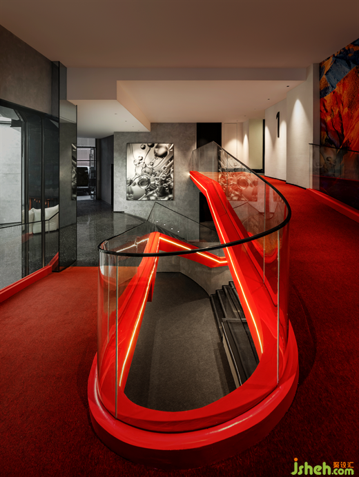 精品酒店設(shè)計流線型的藝術(shù)連廊宛若空間中懸浮的彩帶,打造玲瓏、活力的空間語言。既是功能性的禮賓區(qū)域,也銜接著大堂與客房區(qū)域。