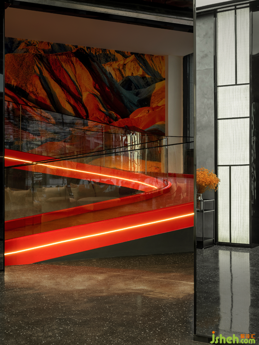 巨幅的丹霞地貌的攝影作品映襯著酒店的主題色彩,瑰麗多姿,猶如大自然的調(diào)色板,呈現(xiàn)出千變?nèi)f化的色彩與紋理。