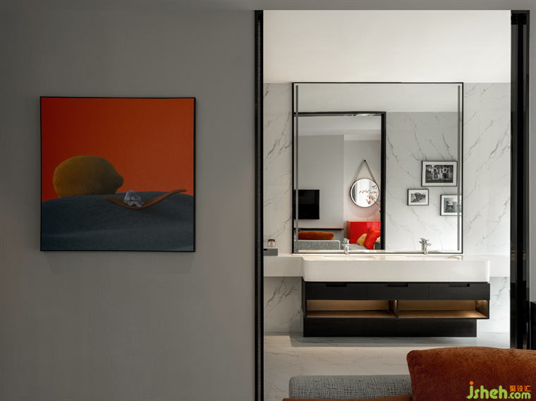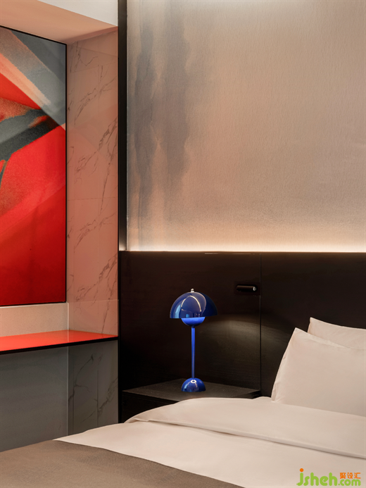 餐廳內(nèi)放置了水藍(lán)色的玻尿酸主題藝術(shù)畫,精品酒店設(shè)計(jì)為空間注入了層次之美,紅色、灰色座椅與水磨石桌面重疊交錯(cuò),輝映著光線的維度。若隱若現(xiàn)的窗外景色,為用餐空間帶來斷續(xù)的節(jié)律感。