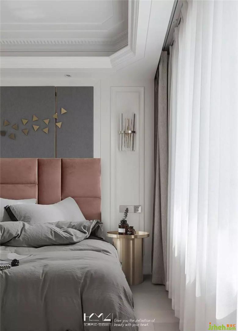 背景墻中間部分運用硬包并鑲嵌香檳色金屬條,營造現(xiàn)代輕奢質(zhì)感,兩側(cè)白色疊級護墻板并搭配裝飾壁燈;床頭柜裝修公司選用了兩款樣式 ,方圓結(jié)合。