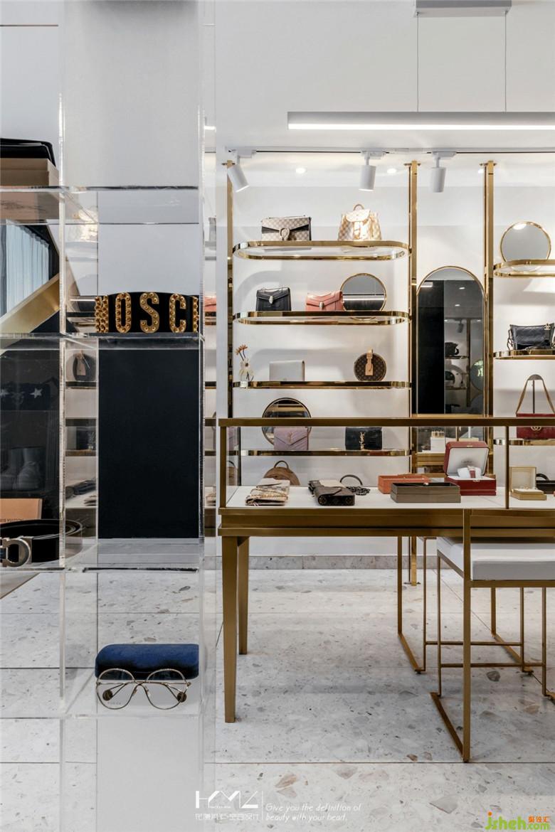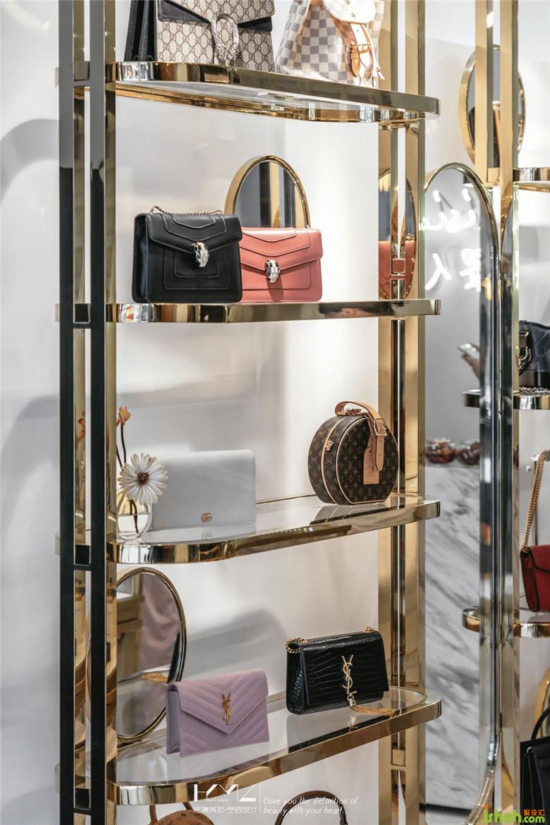 一樓的產(chǎn)品展架,裝修公司使用金色不銹鋼定制框架,結(jié)合玻璃層板,兩種硬度高的材質(zhì),用以襯托皮質(zhì)產(chǎn)品的特質(zhì)。
