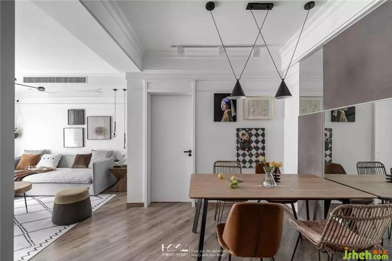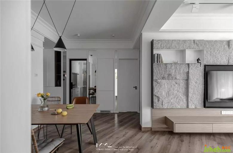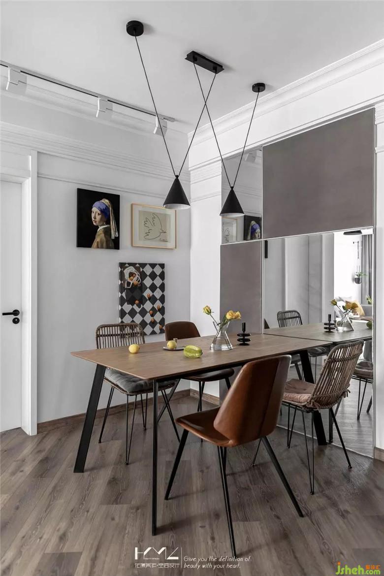 餐廳與門廳裝修公司利用了鏡面元素來擴大空間的視覺感,餐廳背景的硬包既是裝飾作用,又巧妙隱藏了強弱電箱,十字燈條增加了餐廳區(qū)域的亮度與裝飾性。入戶45度斜鋪的地板貫穿客餐廳,個性十足。