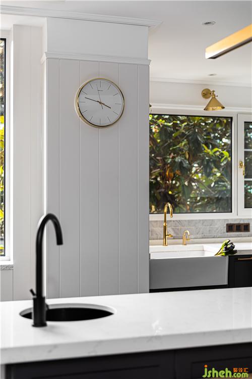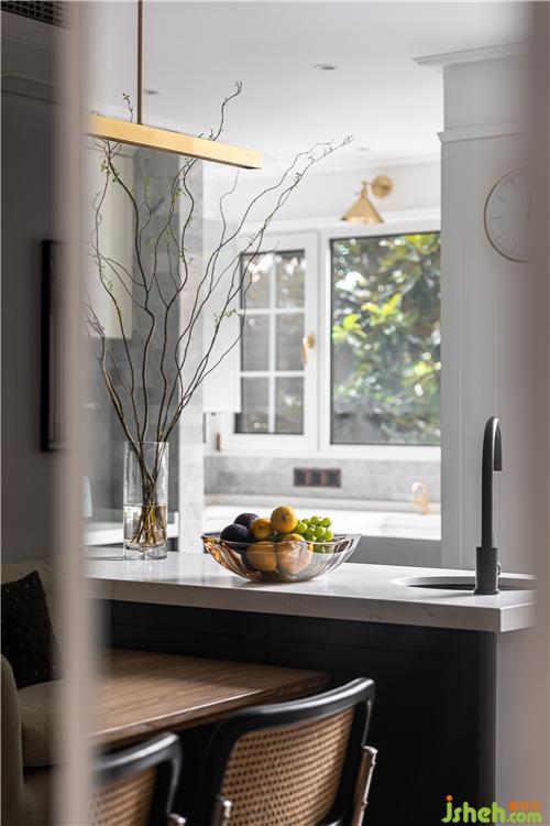 餐廳區(qū)域的島臺與餐桌呈T字型擺放