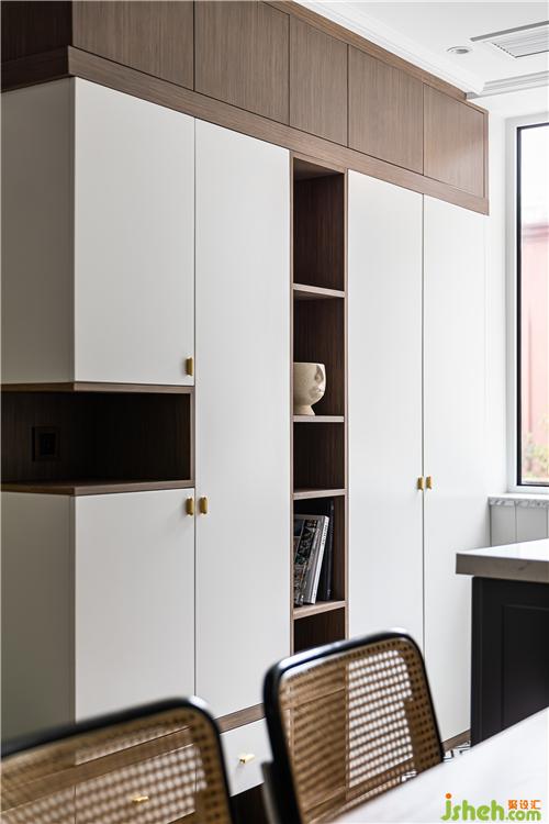入戶左側(cè)設計了整排鞋柜,融合了開架展示與換鞋凳