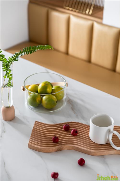 利用廚房轉(zhuǎn)角的承重柱,做了一個(gè)小吧臺(tái),既是廚房臺(tái)面的一個(gè)延伸,又滿足了早餐桌的功能.
