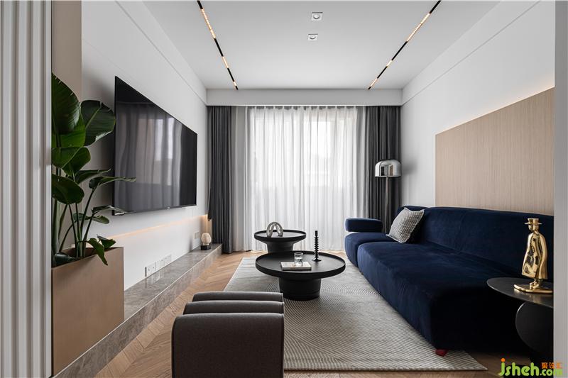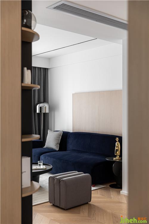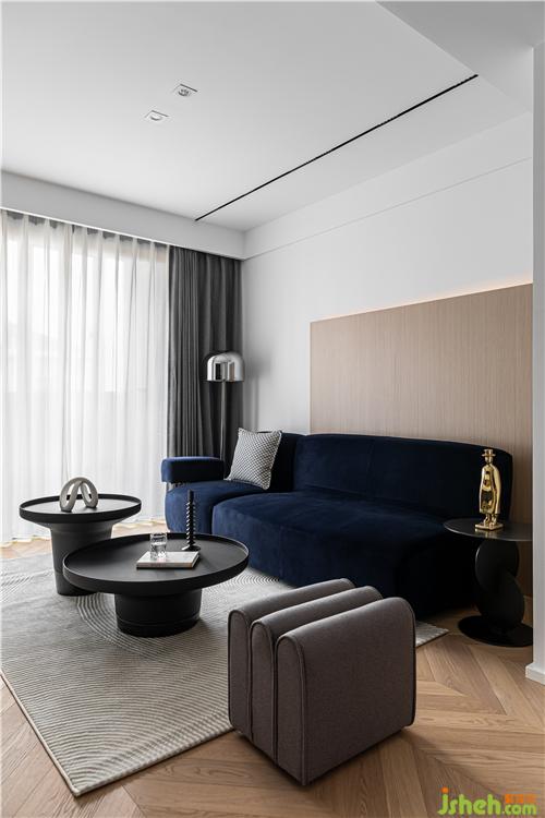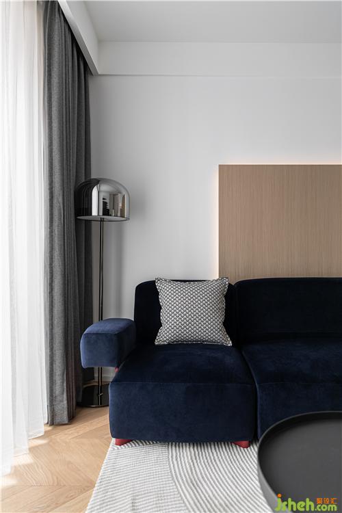 業(yè)主最喜歡的球隊(duì)是巴塞羅那,客廳藍(lán)色調(diào)主沙發(fā)由此而來(lái),與淺灰色條紋地毯形成色彩對(duì)比.