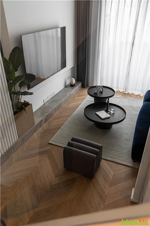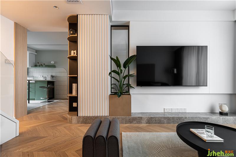 電視背景墻一端設(shè)計(jì)了一組開架與收納柜,錯(cuò)落的功能搭配與材質(zhì)沖擊削弱整面墻的壓抑感;定制的木色花盆與長(zhǎng)虹玻璃隔斷打破背景單一性,創(chuàng)造視覺上的呼吸點(diǎn)室內(nèi)設(shè)計(jì)師.