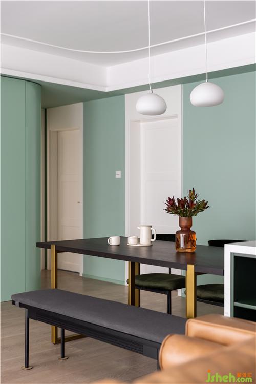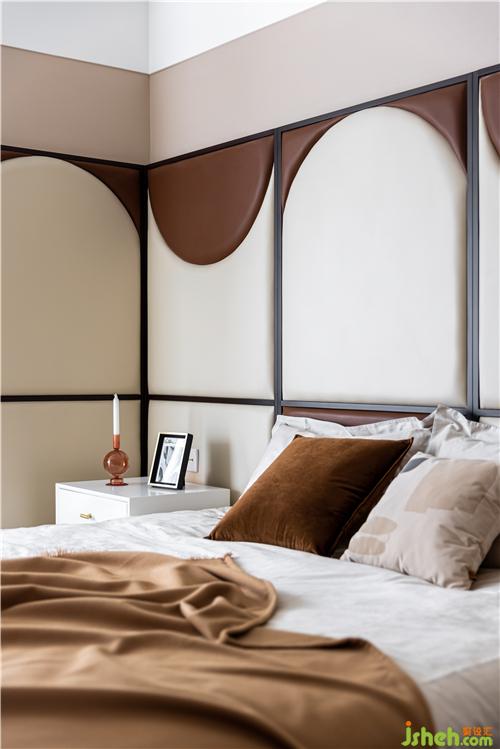 采用巧克力色與奶茶色做弧形拼色軟包床背景,裝修設(shè)計賦予空間一股復(fù)古與暖意.