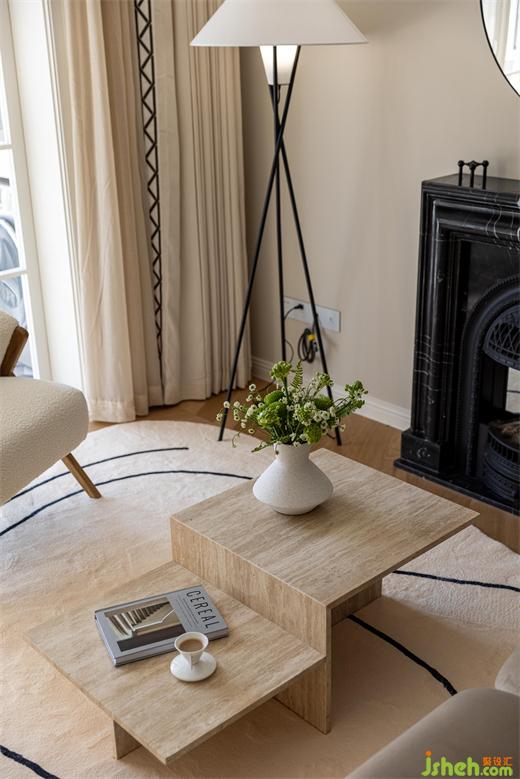 南北貫通的客餐廳采光良好,無論是圍坐的沙發(fā)區(qū)還是圓桌就餐區(qū)皆呈現(xiàn)了其樂融融的家庭氛圍。卡其色、奶咖色、白色,點綴木色及藤編元素營造了休閑溫馨的家居場景。