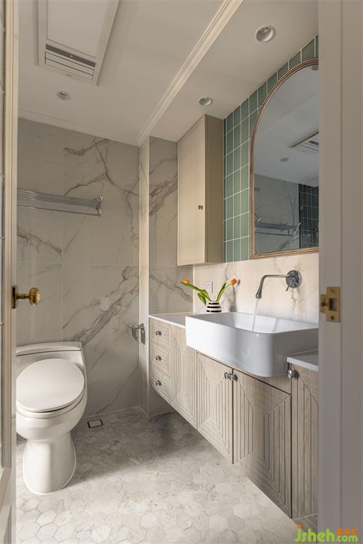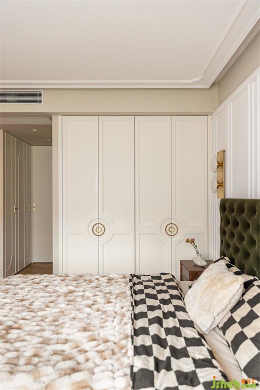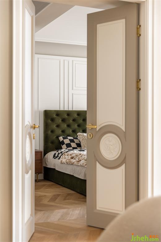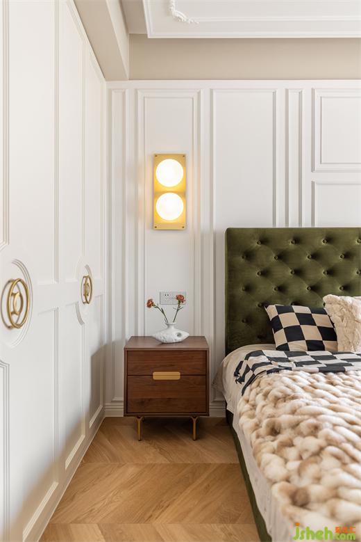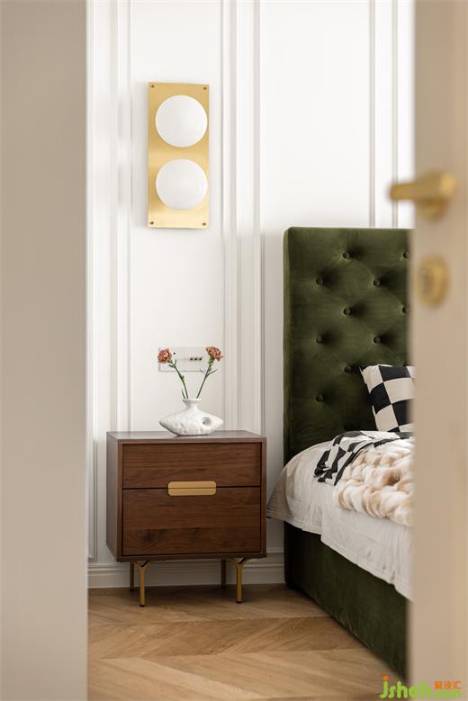 綠色系書房空間不大,卻是家里功能最多的所在,兼具次臥、儲物間,同時容納鋼琴區(qū)。花漾美作裝飾畫結(jié)合了閱讀元素與書房氛圍完美契合,絨布沙發(fā)床與絨布窗簾交相輝映。鋼琴區(qū)開架呼應了客廳的木色元素,柜門上的藤編壁紙為空間帶入幾縷休閑氣息。