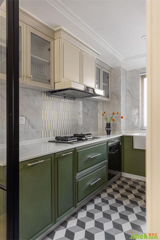 黑色細邊玻璃推拉門造型簡約,最大限度引入北向采光。裝修設(shè)計墨綠色櫥柜與六角花磚、白色瓷盆與銀色不銹鋼龍頭搭配時尚又復(fù)古,玻璃柜門點綴銀色勾邊細節(jié)滿滿。
