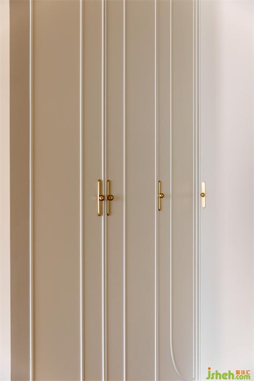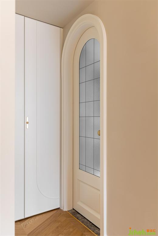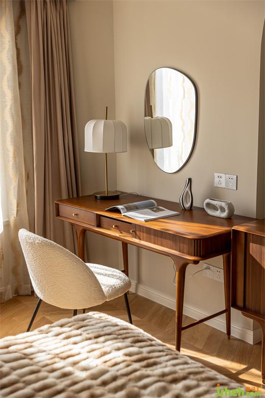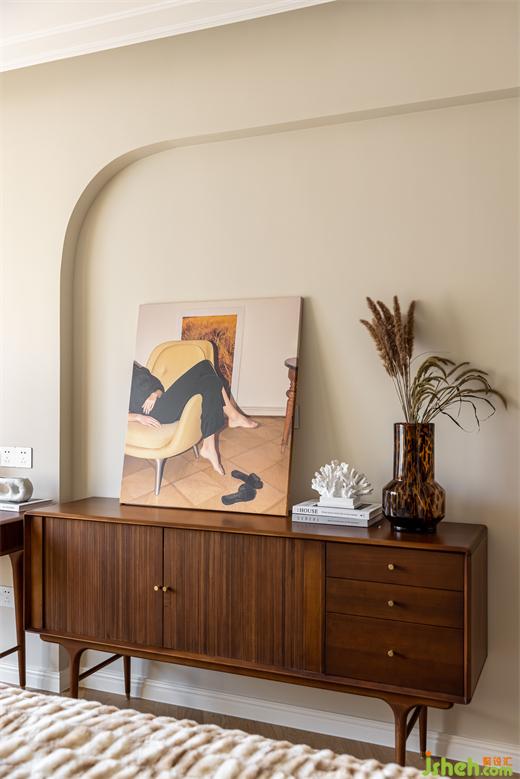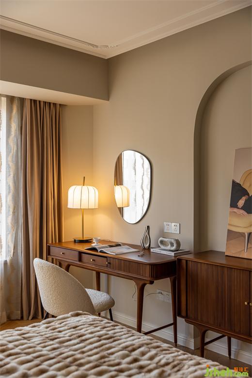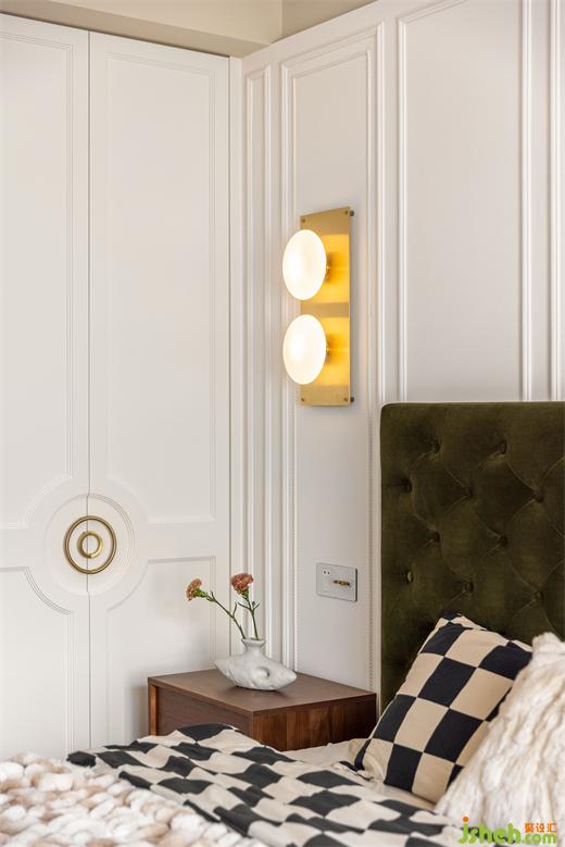主臥延續(xù)客餐廳柔美的淺色系,綠色絨布床與棋盤格床品搭配復(fù)古典雅,裝修設(shè)計深紅色柚木梳妝臺與邊柜紋理通直,色澤光亮,黃銅色燈具與柜門金屬把手點綴精致感,臥室呈現(xiàn)出一種浪漫優(yōu)雅且溫柔動人的氣場。