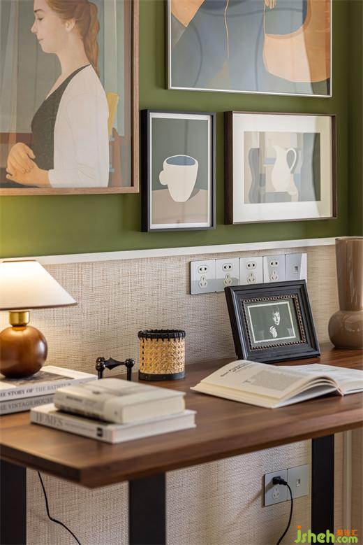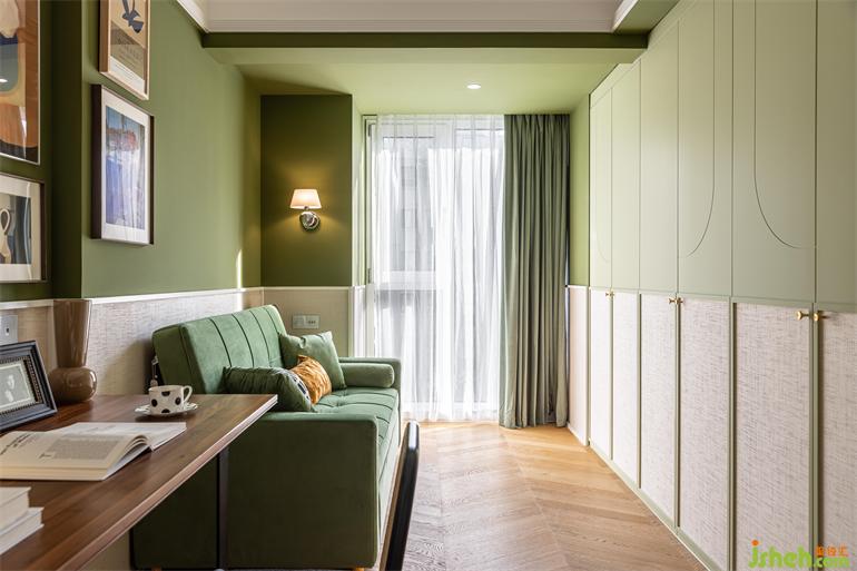 綠色系書房空間不大,卻是家里功能最多的所在,兼具次臥、儲物間,同時(shí)容納鋼琴區(qū)。裝飾畫結(jié)合了閱讀元素與書房氛圍完美契合,裝修設(shè)計(jì)絨布沙發(fā)床與絨布窗簾交相輝映。鋼琴區(qū)開架呼應(yīng)了客廳的木色元素,柜門上的藤編壁紙為空間帶入幾縷休閑氣息。