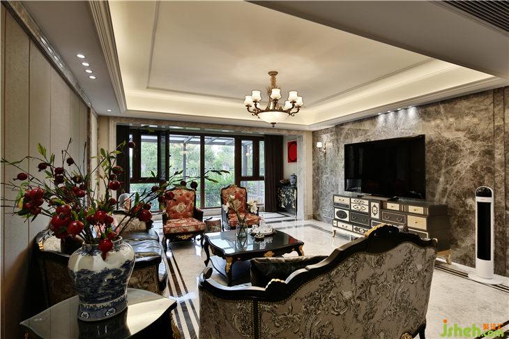 客廳的墻面運(yùn)用了米白色的乳膠漆,電視背景墻是用大理石邊框和咖啡色的硬包做成的,這讓墻面與背景墻更好的融合在一起。沙發(fā)和茶幾雖是色彩深沉的木質(zhì),但其造型秀美再加以色彩跳躍的紅色抱枕和布藝加以點(diǎn)綴,令整個(gè)空間節(jié)奏充滿變化又不失和諧。