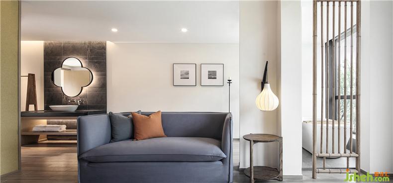床頭藝術(shù)掛件取自“一枝獨(dú)秀”的花枝形態(tài),以此呼應(yīng)杏花居的主題。花木有時(shí),幽居以花為伴,一室清雅,更自可愛。