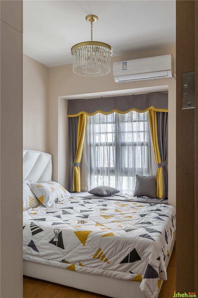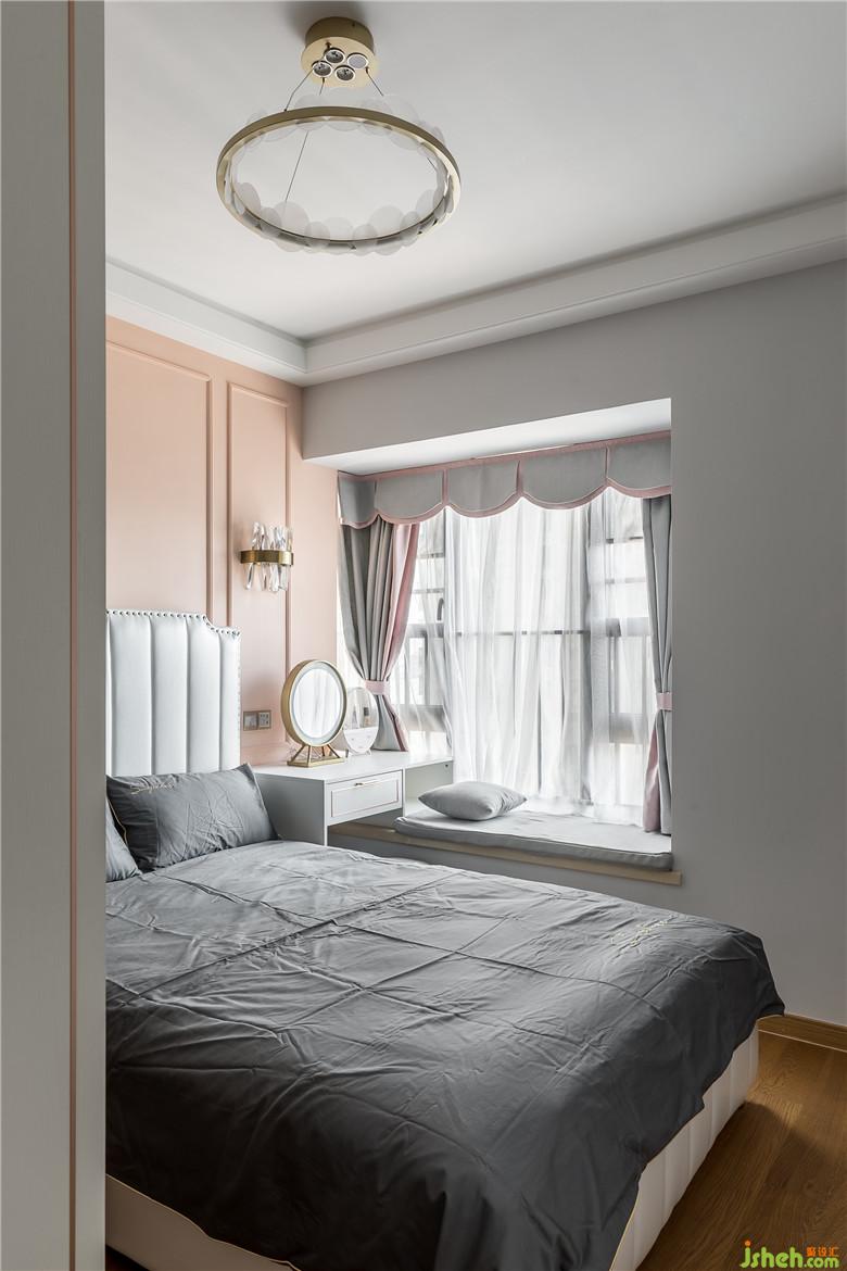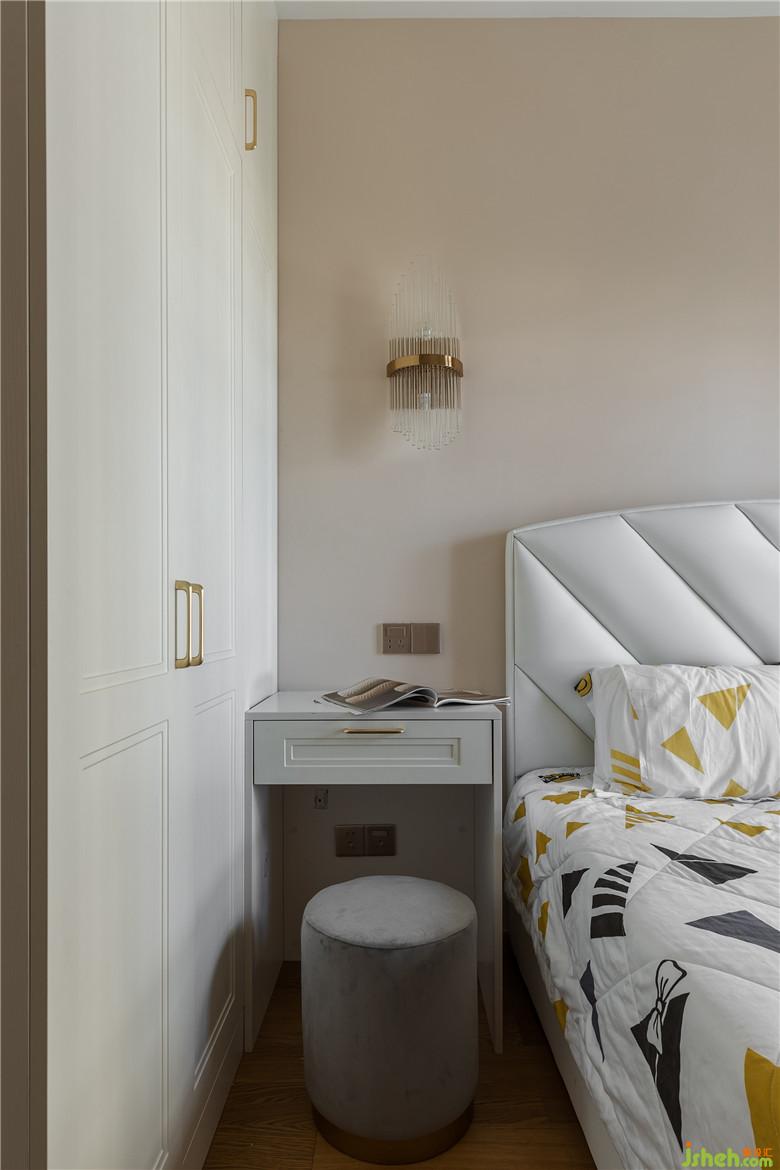 床頭背景以甜蜜溫馨的煙粉色為主調(diào),延伸客餐廳的石膏線條,其他墻面以淺灰色為輔,中和煙粉色帶來(lái)的甜膩,大面茶色玻璃衣柜使空間通透性更好,柜體里面的層板都有燈帶,透過(guò)里面的燈光,從外面看質(zhì)感是很高級(jí),也是主人喜歡的輕奢感。