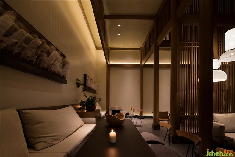 卡座區(qū)位于酒吧空間最里的位置,墻面的蘆葦裝置內(nèi)設(shè)燈光,裝修設(shè)計(jì)打造出蘆葦似動(dòng)非動(dòng)的搖曳感,卡其色軟包與粗麻編制的紋案形成強(qiáng)烈的反差感,體現(xiàn)出小漁村的古樸安靜的氛圍。