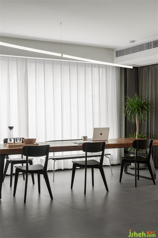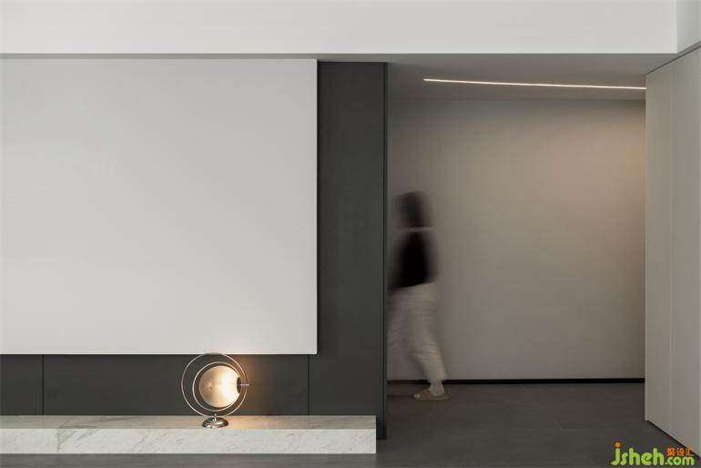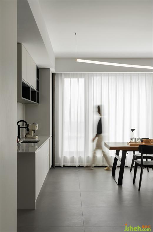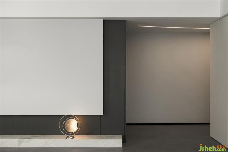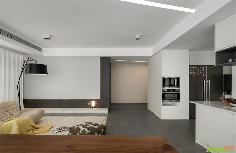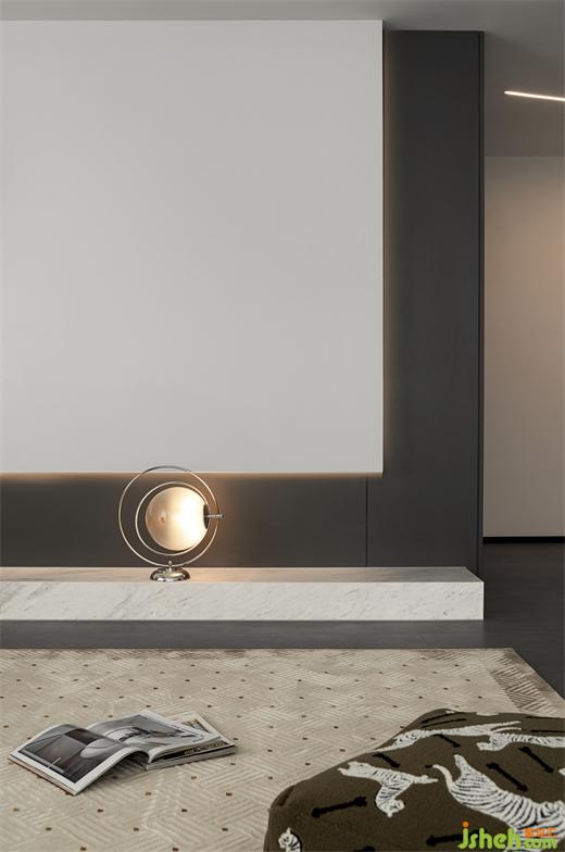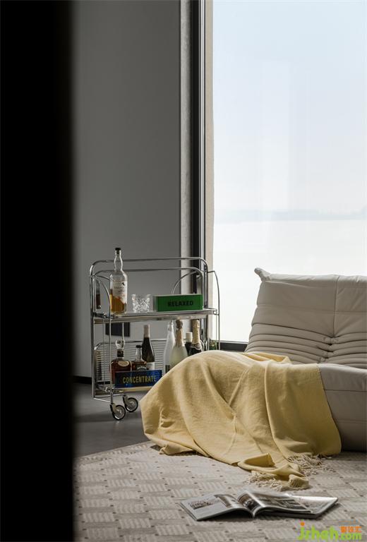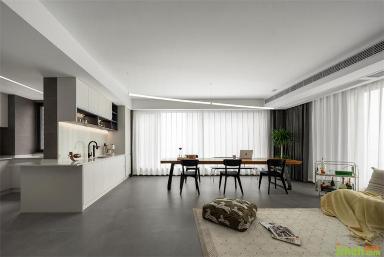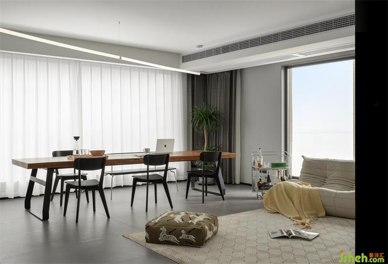 藝術(shù)住宅設(shè)計極窄邊框的大落地玻璃把江景收入“畫框”,室內(nèi)外的互動讓居家美學(xué)呈現(xiàn)出自然的藝術(shù)。大橫廳的頂上斜吊一道光柱,從廚房門口延伸至長桌盡頭。藝術(shù)住宅設(shè)計水泥灰的地磚鋪陳出極簡精致生活的底色?!懊x”沙發(fā)背后矗立的投影儀代替電視機為生活增添了歡樂的劇情。