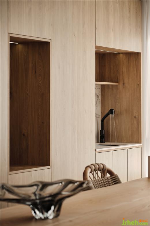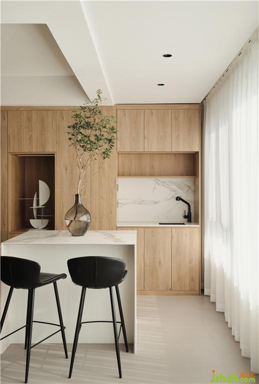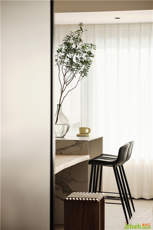 一層大橫廳的構(gòu)圖,鎮(zhèn)江豪宅設(shè)計(jì)將起居室與餐廳、書(shū)房平鋪展開(kāi),空間之間的互動(dòng)變得直接明確。原木色調(diào)的家具配合奶咖的墻壁,展現(xiàn)出生活的溫柔表情。餐廳與水吧空間合二為一。立柜隔斷了餐廳與書(shū)房,白色鋼板的雕塑靜立壁龕之中,讓就餐環(huán)境融入當(dāng)代藝術(shù)的調(diào)性。