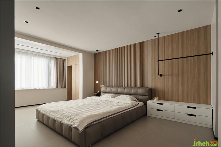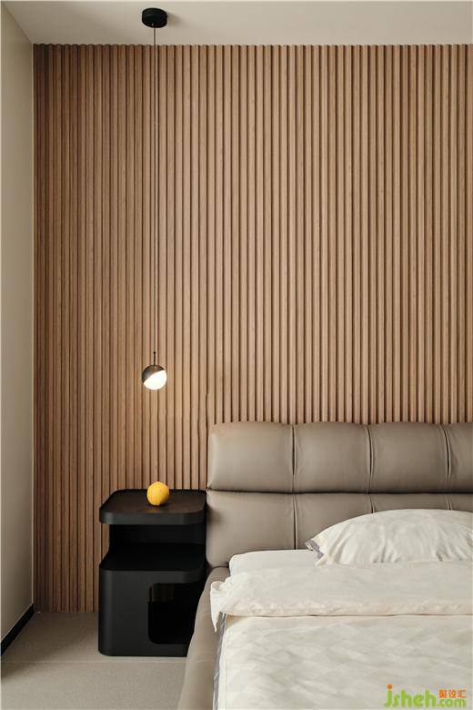 二樓原陽臺打通,鎮(zhèn)江豪宅設計讓主臥可以直達陽光,打開空間的同時亦開闊了心境。木紋格柵的床背景雕琢出空間細膩的一面。定制床頭長柜上方黑色烤漆藝術(shù)支架,功能與美感兼具。