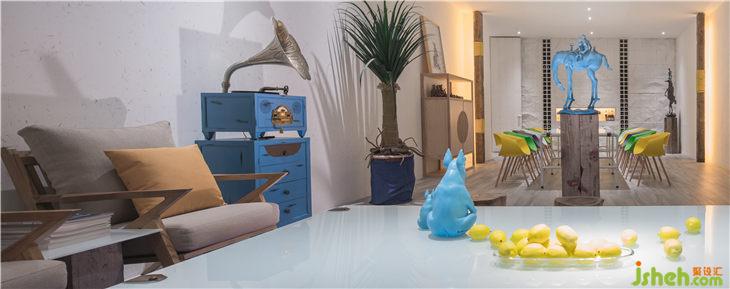 稻草漆墻面純樸自然,檸檬黃、孔雀藍裝飾點綴其中,賞心悅目。簡潔的硬裝和體現(xiàn)董事長個人情懷的軟裝、藝術(shù)品相互融合。