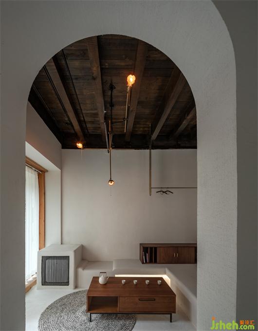Featuring plain white rock wall, dark brown log andCycladic-style arch, [Su] and[Du] areretro andnostalgic, leaving a unique imprint on thespace.