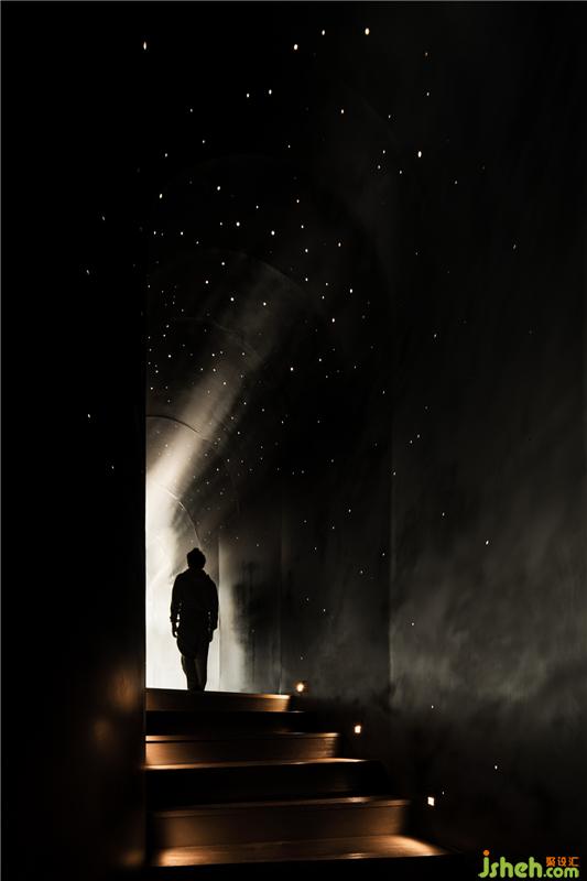 連接一層與二層的封閉式甬道,是黑暗的,作為空間的轉(zhuǎn)換、停頓乃至懸置,是空間行為關(guān)系中更深層次的體驗(yàn),因?yàn)槌颂?,黑夜里的群星同樣滋養(yǎng)我們的夢(mèng)想。