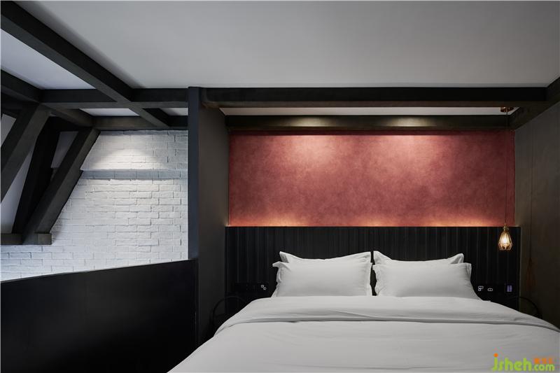 所以我們利用高挑的層高關(guān)系把整個空間上下一分為二,這不僅有效的利用了空間的使用率,酒店設(shè)計也從功能分區(qū)上進行了動靜關(guān)系的思考;一層空間便承擔起了公共區(qū)域的作用,客廳、衛(wèi)生間、儲藏空間被放置其中。這亦是一個動態(tài)的空間,我們運用工廠固有的一些符號,不斷強化著我們的視覺主題,體驗感在進入房間的第一刻便鋪面而來。