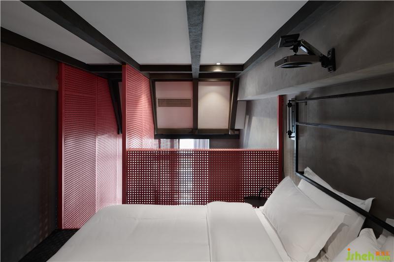 二層作為居住空間,更多的考慮來自于舒適性與便利性的思考。豐富的燈光形式與地毯的設(shè)置,都是在弱化鋼材所帶來的冰冷感,而暗紅色的藝術(shù)涂料,不僅能增添空間的層次感跟包裹感,亦能產(chǎn)生些許的溫暖感受。每一個房間我們都在睡眠空間相關(guān)的區(qū)域設(shè)置了便于掛取的衣帽設(shè)備,而在空間較為充足的房間里,我們均設(shè)置了上下兩處清潔衛(wèi)生空間,以此來滿足更為便利的生活功能使用,帶來更為舒適的居住體驗。