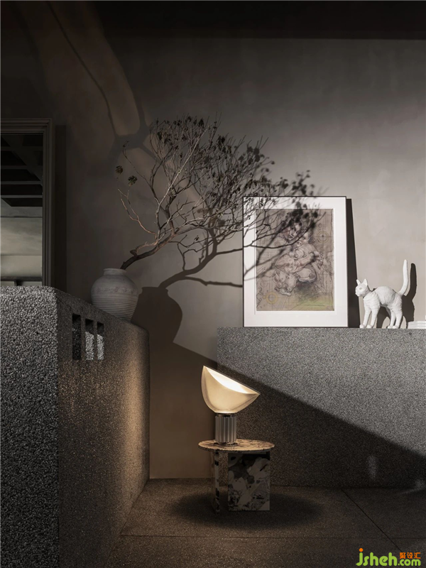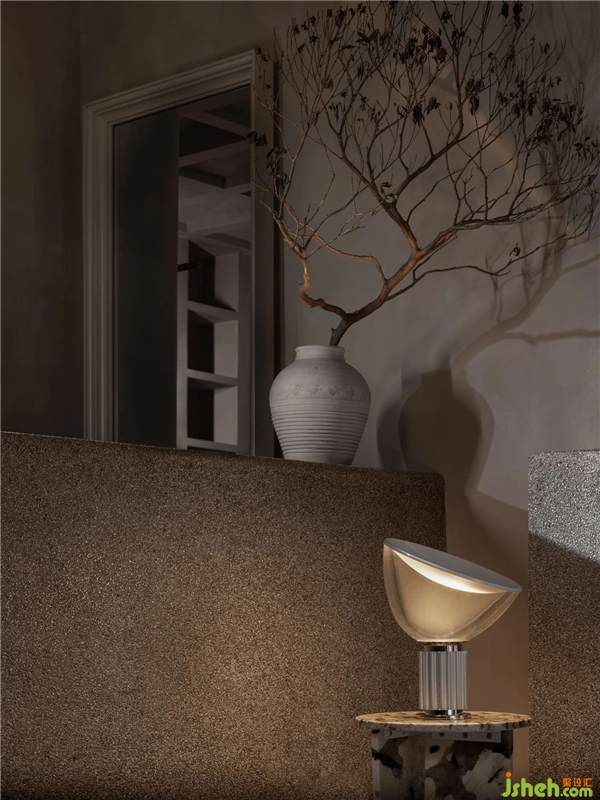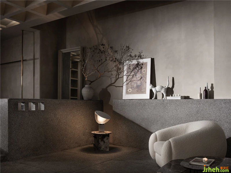 其次,展廳設計在軟裝的選擇上我們摒棄了統(tǒng)一風格產品扎堆的處理方式。而是以一個買手的姿態(tài)去挑選適合的家具產品。從Franco的Tre pezzi扶手椅,到Jean Royere的大白熊,再到當代傳奇設計師Philippe Starck的經典三足椅。無一不是向經典致敬。而flos的燈具與cc-tapis的地毯則是當下產品設計中的典范。我們將其整合在一起,在這個既沖突又奇妙的空間里,趣味橫生。