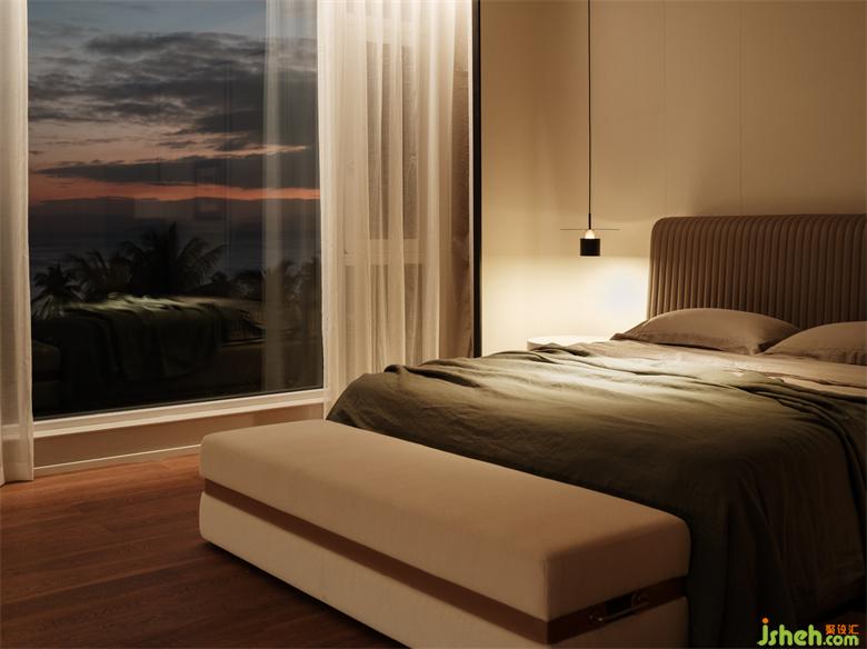 三亞度假別墅設(shè)計(jì)以一層空間為基準(zhǔn)。我們將樓上的空間界定為更加安靜與私密的靜態(tài)空間。二樓作為兒女及晚輩的主要生活空間,被劃分為了三間臥房。因?yàn)闆]有了大量且長期的儲藏需求,所以我們給予了每個(gè)空間更大的尺度關(guān)系,讓其體驗(yàn)感受得以更加舒展與放松。當(dāng)然,這才符合度假的意義。