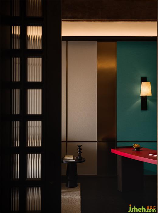 因其釀造作坊的特殊性(國(guó)家級(jí)非物質(zhì)文化遺產(chǎn)& 國(guó)家級(jí)文物保護(hù)單位)原因。所以內(nèi)部接待的核心人員均與技藝、歷史、政要相關(guān)。所以傳統(tǒng)的裝飾材質(zhì)、質(zhì)地、以及色彩關(guān)系被大量運(yùn)用。比如鋪地使用的黑色金磚、大面積使用的刺繡墻布、以及隨處可見(jiàn)的原木質(zhì)地。紅、綠色的撞色搭配,也通過(guò)新的方式,非遺會(huì)館設(shè)計(jì)在空間里呈現(xiàn)。