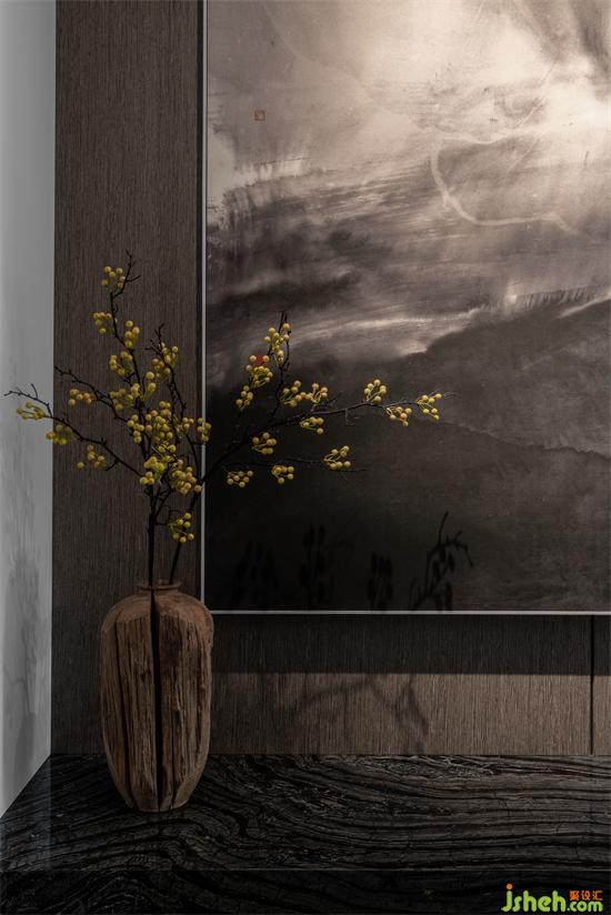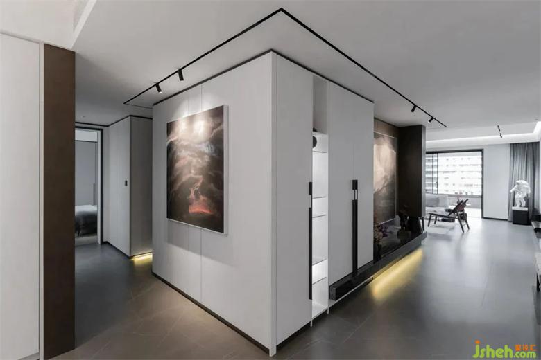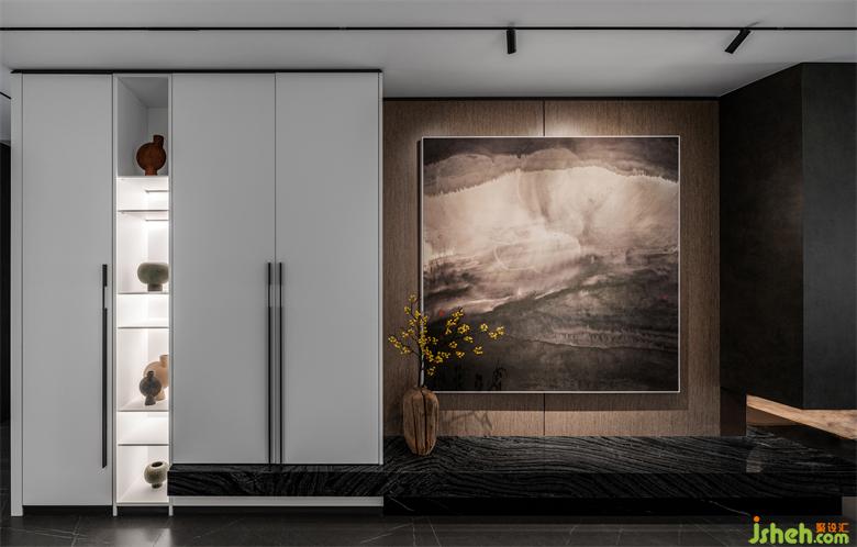 本案業(yè)主對家居設(shè)計的需求非常明確,他們不追求奢華的形式,但對品質(zhì)與內(nèi)涵非常注重,這些要點在入戶玄關(guān)的設(shè)計上集中體現(xiàn)出來。麗雅龍城住宅設(shè)計將入戶正對墻面做白色柜體與玄關(guān)墻,打破空間第一視覺的沉悶感,用藝術(shù)擺件與水墨畫點綴木飾面,內(nèi)斂、大氣,高級感油然而生。