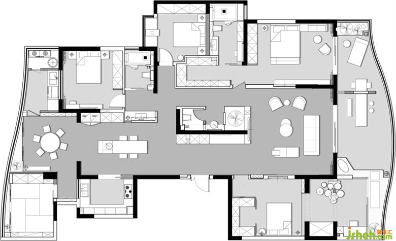 5、將臨近餐廳一側(cè)的大陽臺利用起來,增加了中餐廳、洗衣房、保姆房,完善空間功能;