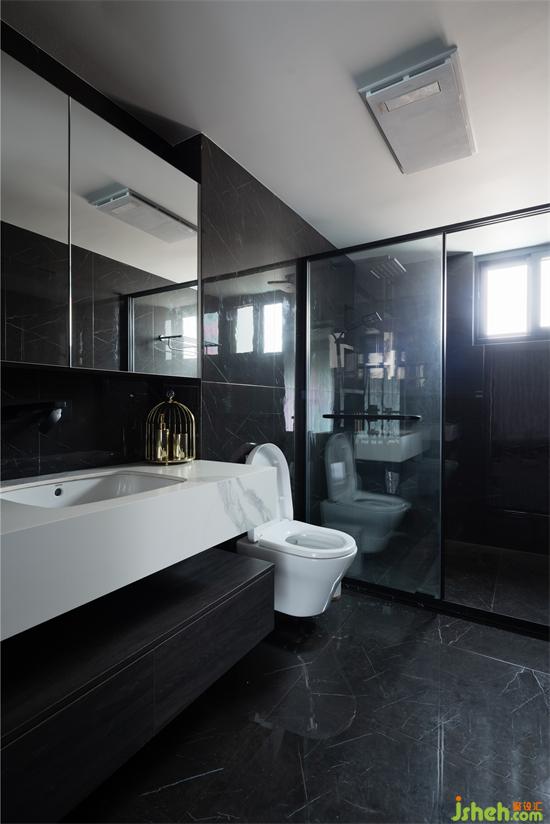 客衛(wèi)干濕分區(qū)由外向內(nèi)延展,懸空的臺(tái)盆與儲(chǔ)物柜,利用黑白碰撞的張力,鑫嘉園家居設(shè)計(jì)增加空間的輕盈感,干凈純粹。