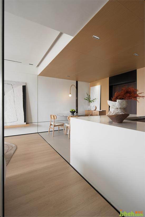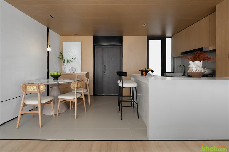 1、取消廚房移動(dòng)門(mén)、拆除墻體改為開(kāi)放式廚房,增加島、提升空間視覺(jué)尺度感;