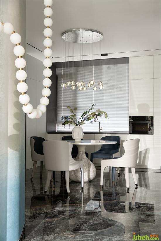 餐廳中間位置放上藝術(shù)感極強(qiáng)的餐桌椅