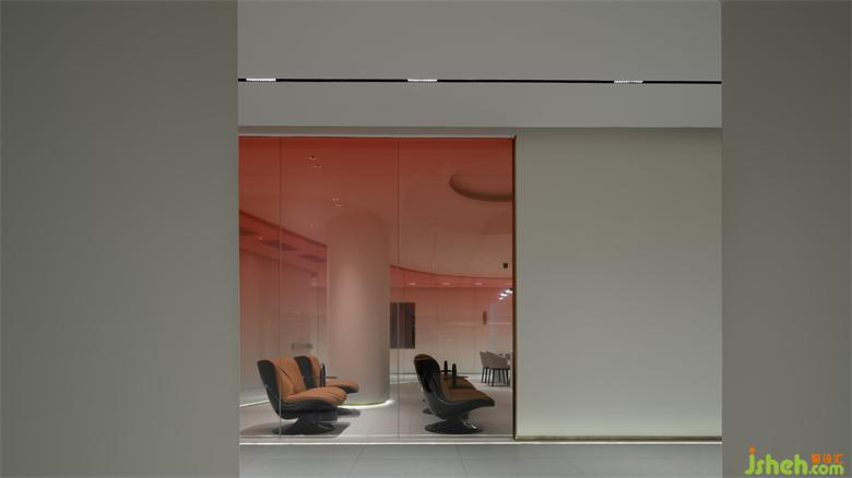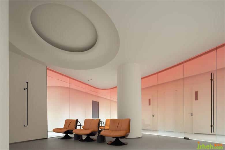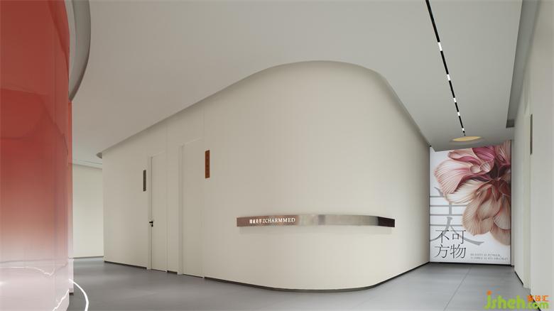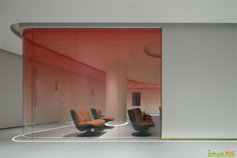 生活美容區(qū)像柔軟的水被裝進(jìn)了一個(gè)異形玻璃容器,佇立在整個(gè)空間中心位置。旗艦店設(shè)計(jì)從上至下透感漸變的紅色幕墻,像是光的指引,醫(yī)美旗艦店裝修設(shè)計(jì)折射出神奇的光影,以流暢、純粹、柔和結(jié)合女性之美帶來萬變的形態(tài)。