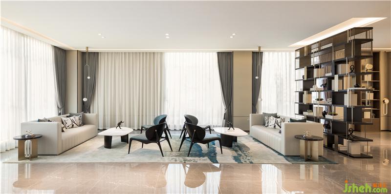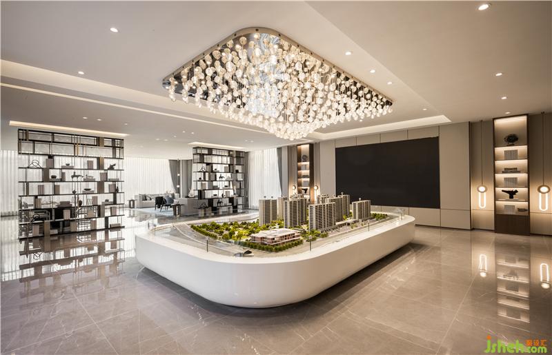 光線定義著空間的氛圍和感覺(jué)。沙盤(pán)燈取形于蕩漾流動(dòng)的漣漪,光影自然流動(dòng)間營(yíng)造出精致而輕盈的視覺(jué)體驗(yàn)。博物架錯(cuò)落隔開(kāi)不同的功能區(qū)間,東方意境在遮蔽與顯現(xiàn)的曖昧關(guān)系中含蓄流露。售樓處設(shè)計(jì)