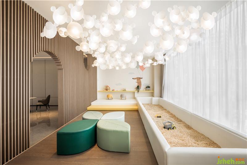 Behind the archway comes the children's area. The large floor-to-ceiling light of bubble-shaped ceiling lamps with surrounding fresh and bright color creates a spacious and lively fairy tale space. The simplicity silently resonates with the uniformity, linking the area to the outer zones as a whole.