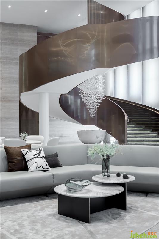 洽談區(qū)另外一側(cè)的水吧臺也形成了鮮明的視覺焦點——兩層高的玻璃酒架在內(nèi)置燈帶的烘托下顯得明亮通透,水吧臺面則延續(xù)旋梯造型,如飄帶漫卷而上。裝修設(shè)計