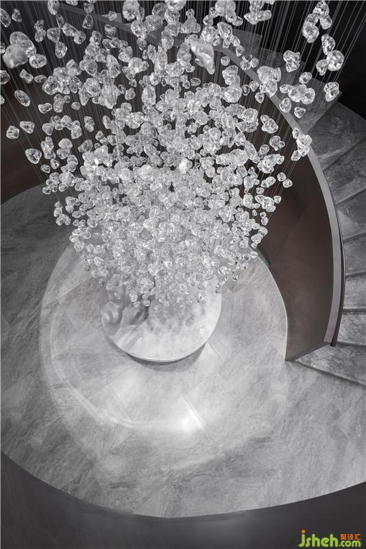 旋梯扶搖而上,軸心處水滴落石騰空而下,仿佛時光在流動之中倏忽停擺,將萬物于片刻中定格成了永恒光景。碎雨擊石,嘈嘈切切,落在水色氤氳的石材上四下漫淌,澄觀的詩意有如實質(zhì)。