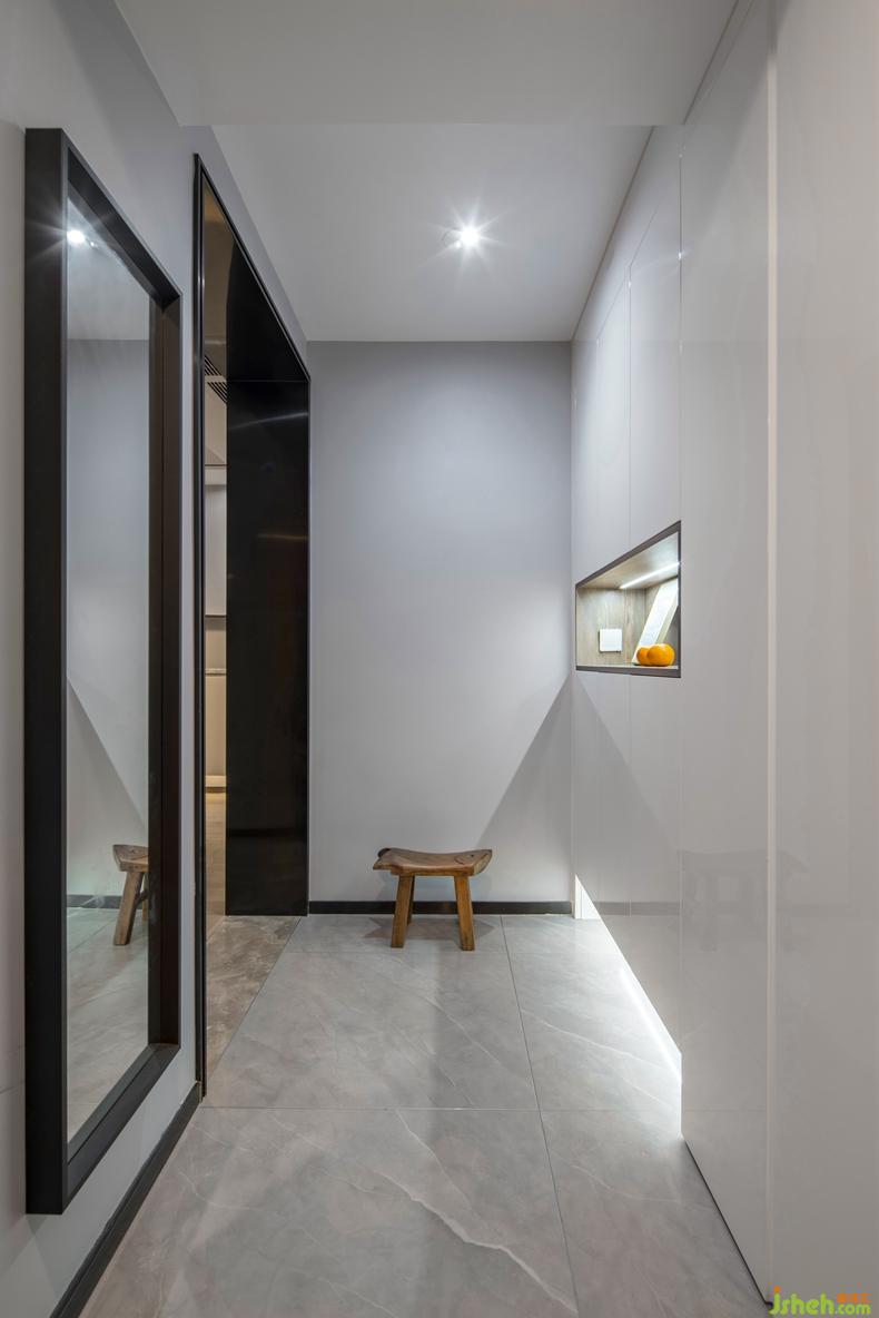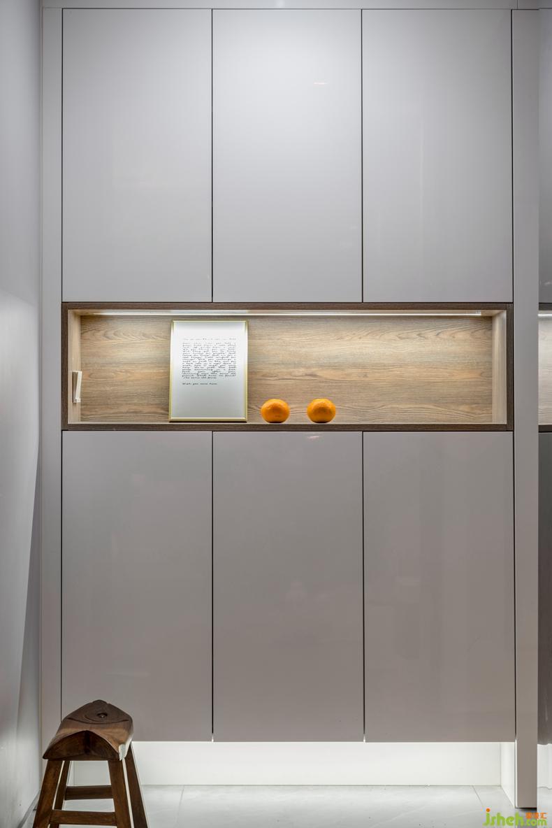 沒有體積龐大的換鞋凳,小巧質(zhì)樸的板凳足以滿足需求。鞋柜中間的設(shè)計(jì)可以存放鑰匙、包包等小物件,十分方便。人性化的燈光布局,讓照明不再有盲區(qū)。