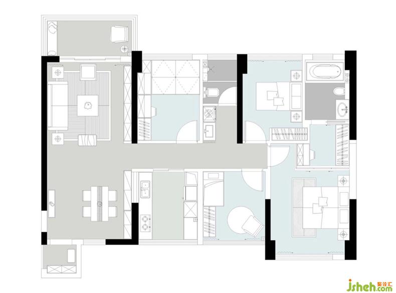 5.公共衛(wèi)生間打造成干濕分區(qū),并將洗衣機(jī)干衣機(jī)放在干區(qū),為陽臺(tái)騰出更多空間休閑。